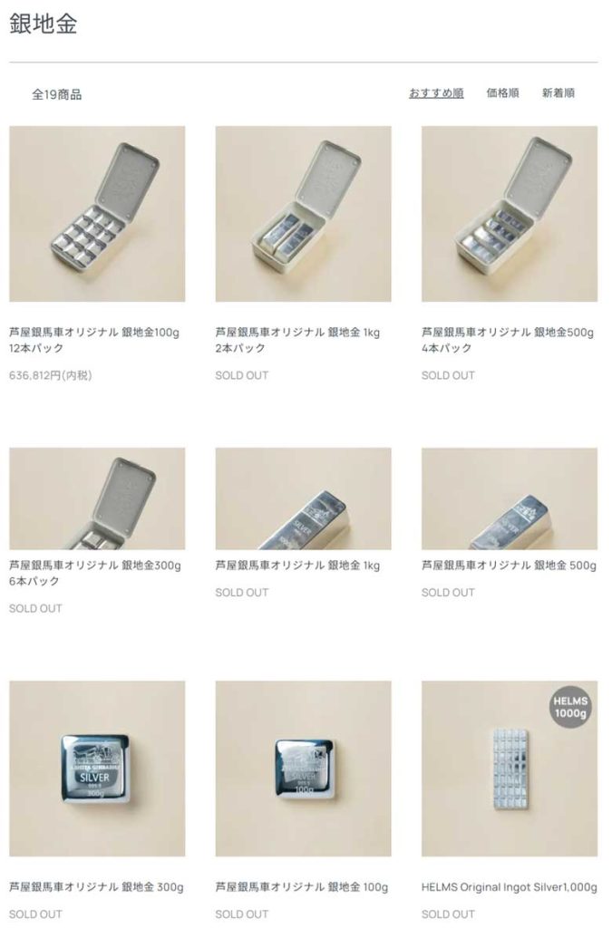 「芦屋銀馬車オリジナル 銀地金100g 12本パック」のみ販売あり。