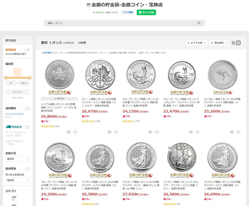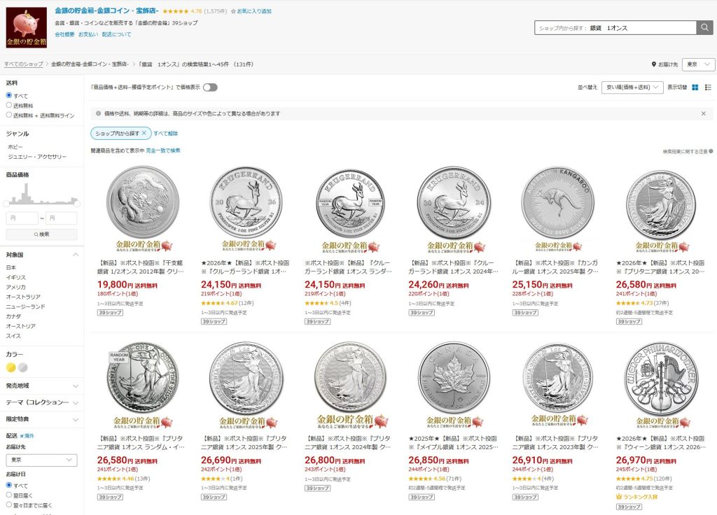 他店では、地金型銀貨にかなりのプレミアムが上乗せされていることも多いですが、